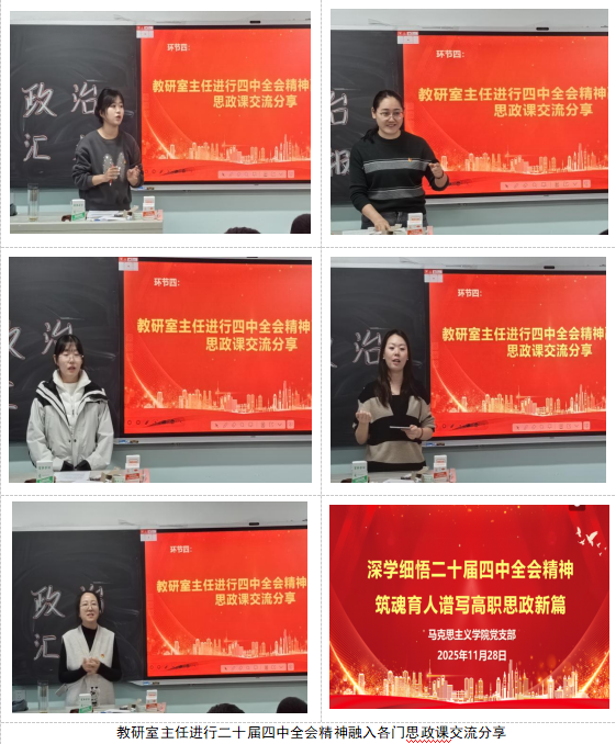 为深入学习贯彻党的二十届四中全会精神,推动全会精神与思政课教学深度融合,切实提高思政课教学质量。11月28日下午,马克思主义学院党支部组织各教研室和全体党员教师开展“深学细悟二十届四中全会精神 筑魂育人谱写高职思政新篇”主题党日活动。